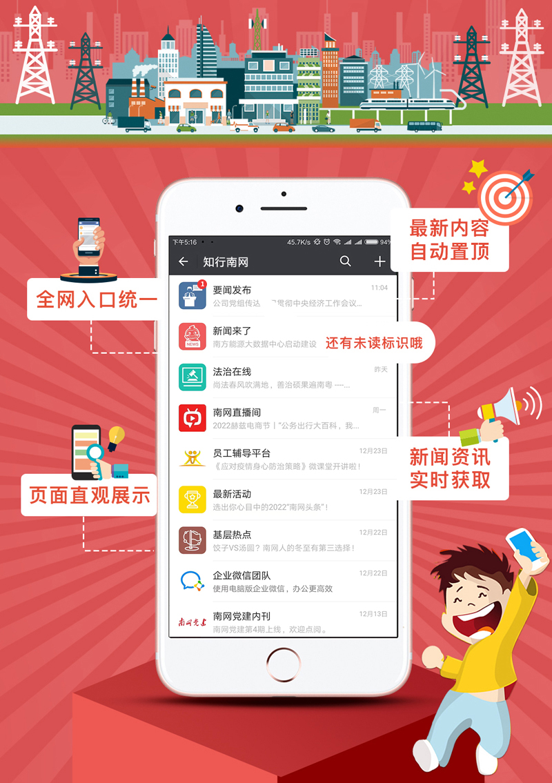“知行南网”微信企业号,是一个集企业内宣、活动组织、员工互动、员工服务为一体的移动掌上家园。目前已经上线“新闻来了”、“高层声音”、“基层热点”、“最新活动”等系列特色栏目,是自拍偷拍 践行“以知促行 知行合一”知行文化品牌的主要新媒体阵地。“知行南网”微信企业号成为全天候、全方位、全覆盖的企业宣传文化工作阵地,也是员工的网上精神家园。